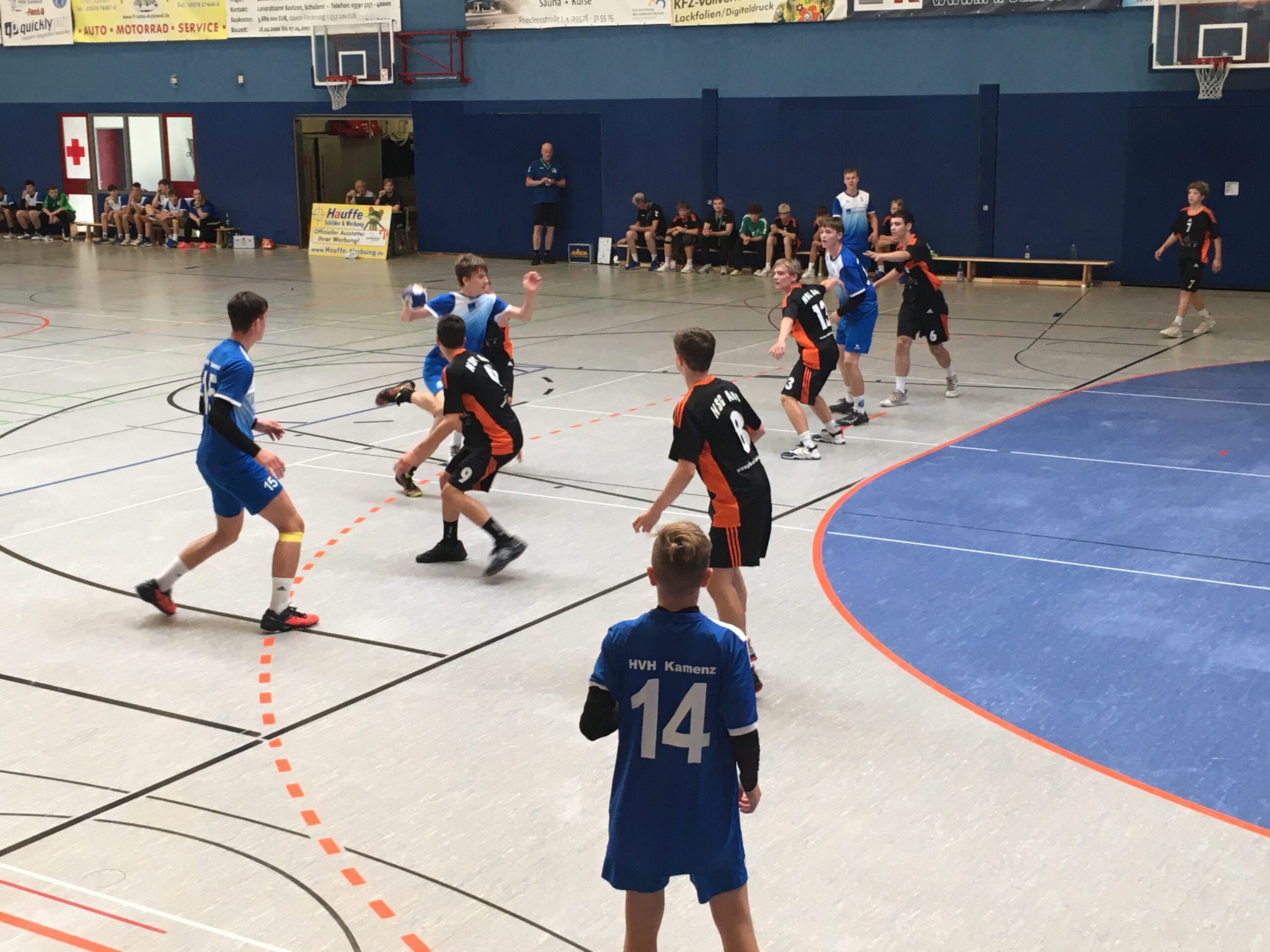 Die Anspannung vor dem ersten Spiel in der neuen Liga und vor eigenem Publikum war riesig. Dies war unseren Jungs auch deutlich anzumerken und so begann man die Partie noch leicht unkonzentriert und fehlerbehaftet. Das nutzen die Gäste wiederum zu einer schnellen 1:3 Führung in der 5. Spielminute aus. Darauffolgend stabilisierte sich die Abwehr der Hausherren und man konnte in Minute 14 durch das 7:6 erstmals in Führung gehen. Im Angriff unserer B-Jungs war in dieser Phase allerdings immer noch Luft nach oben. Dennoch konnten sich die Kamenzer bis zur Pause auf 13:9 absetzen.