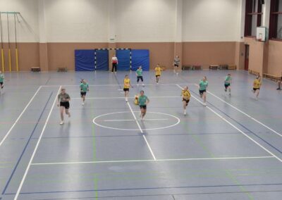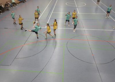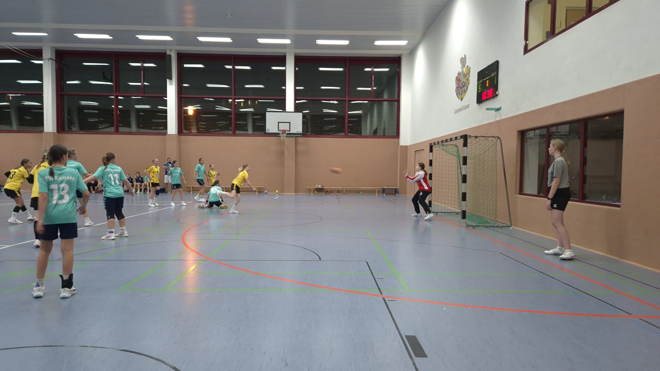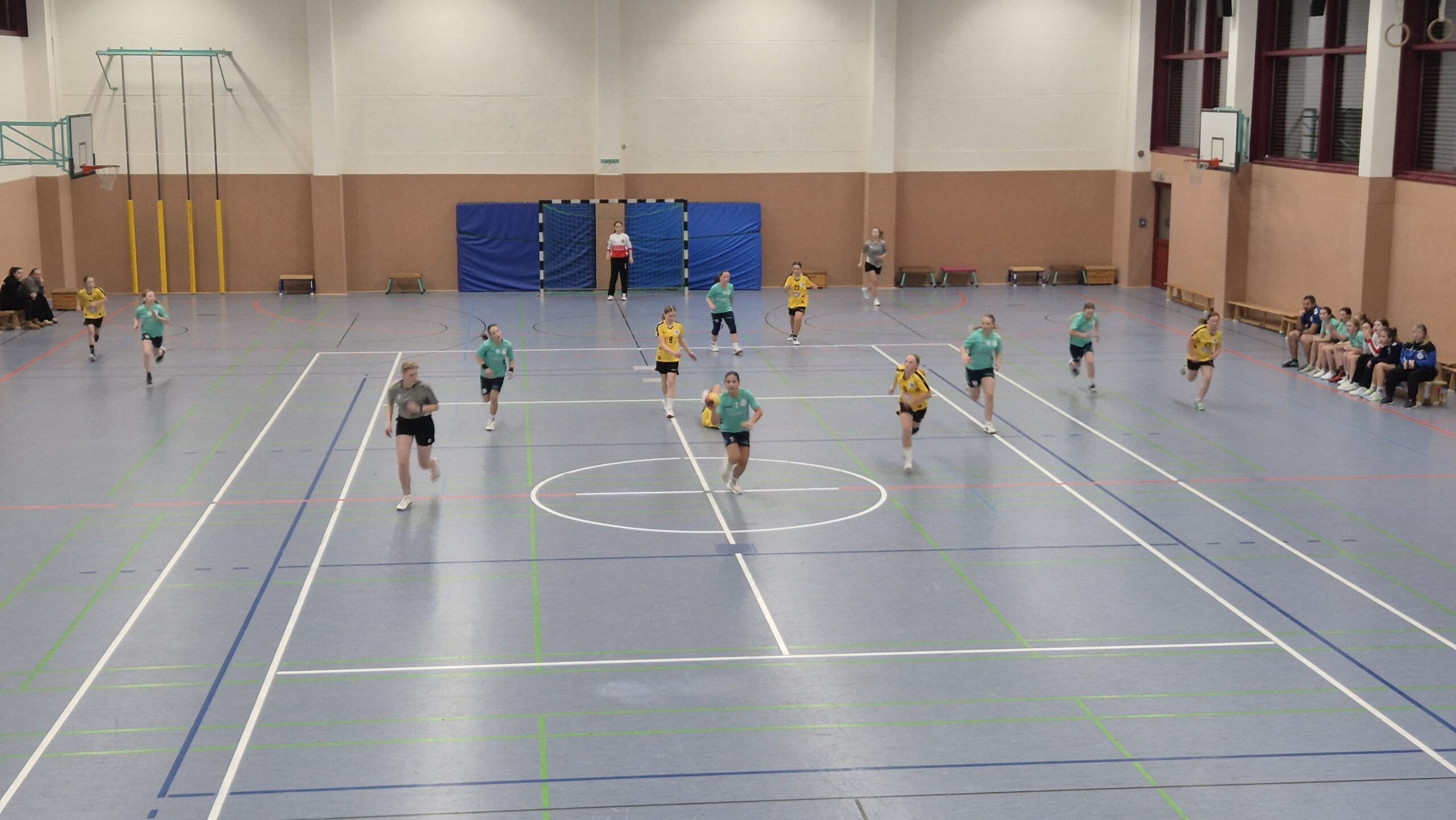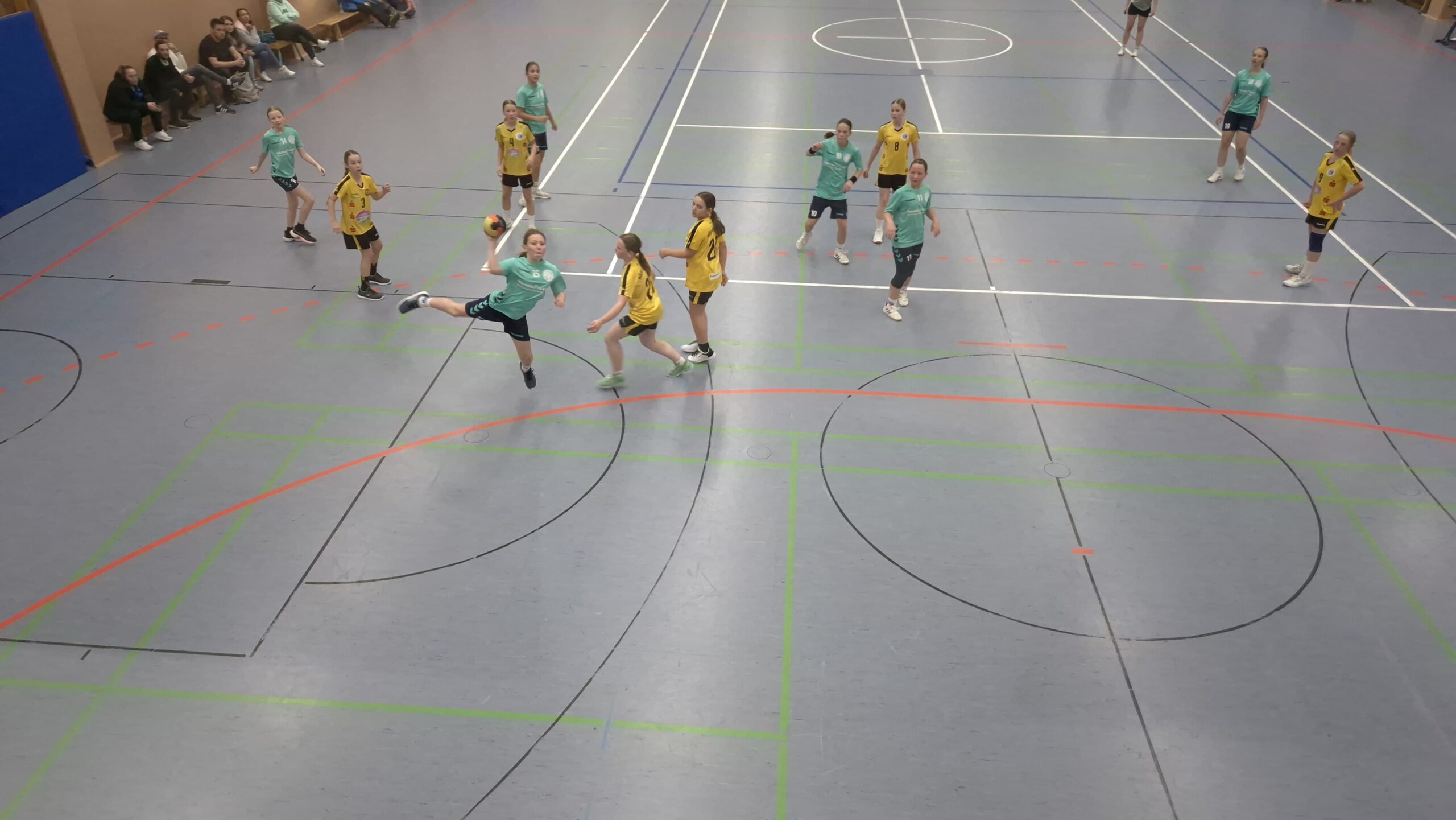 Nach Anpfiff der Partie konnten wir sogleich in Führung gehen. Dann unterliefen auf beiden Seiten viele technische Fehler, sodass wir auf die nächsten Tore etwas warten mussten. Nach 5 Minuten konnten wir immerhin die Führung auf 3:0 ausbauen. Dann schlichen sich immer mehr Probleme in unserer Abwehr ein, zu passives Verhalten und keiner Unterstützung der Mitspieler sorgten für ein paar Tore für die HCR. Doch zum Glück hatten wir hinten noch unsere Torfrau, die sehr viele Bälle parieren konnte uns so unsere Führung festhielt. So ging es mit einem Halbzeitstand von 10:6 in die Pause.