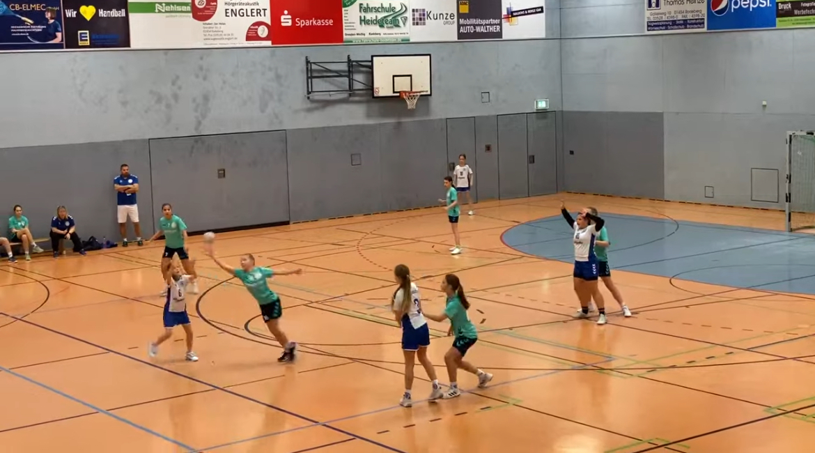 Nach Anpfiff des Spiels mussten sich die Mädels erstmal abtasten. Die Abwehr stand an diesem Tag sehr sicher, jedoch scheiterten wir wieder einmal am Tore werfen. Die Bälle wurden sehr unpräzise in Richtung Tor befördert und so stand es bis zur 3. Minute 0:0. Nur 10 Sekunden später konnten wir über die 2. Welle endlich mit 0:1 in Führung gehen. Danach waren die HVH-Mädels endlich wach und netzten vorne Ball um Ball ein. Auch unser Abwehrtraining machte sich nun bemerkbar und wir konnten die Radeberger Mädels des Öfteren ins Zeitspiel zwingen oder den Ball sauber rausspielen und in schnelle Tore umwandeln. In der achten Minute sah sich der Radeberger Trainer gezwungen eine Auszeit zu nehmen, um seine Mädels neu einzustellen. Davon ließen sich aber die Lessingstädterinnen jedoch nicht beirren und standen hinten weiter sicher. Besonders auf Kreismitte war an diesem Tag kein Durchkommen möglich, und so fingen die Lessingstädterinnen weiter die Bälle ab und bauten ihre Führung bis zur Halbzeit auf 1:11 aus.