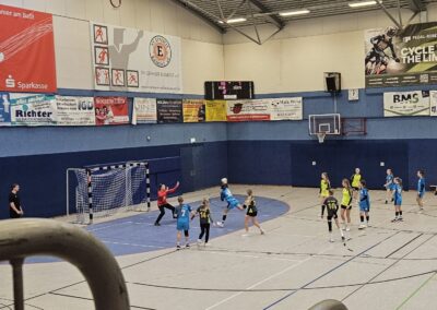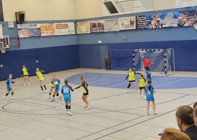 In der 17. Minute reagierten die Trainer, nahmen eine Auszeit und stellten die Mannschaft neu ein. Die Ansprache zeigte Wirkung: UnsereMädels verteidigten nun deutlich offensiverund aggressiver. Doch auch der Gegner stellte sich um, erkämpfte sich Bälle und erbaute sich bis zum Halbzeitpfiff einen kleinen Vorsprung. Über die Stationen 4:4, 8:8 und 11:11 ging es schließlich mit einem 13:16-Rückstand in die Pause.