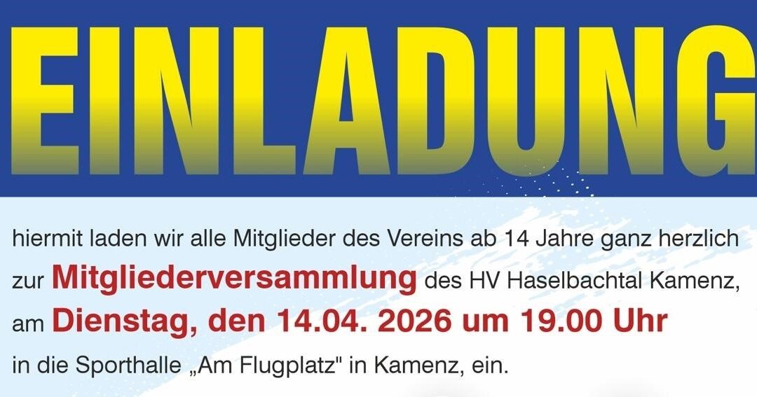 Anliegend erhaltet Ihr die Einladung zur Mitgliederversammlung des HVH Kamenz e. V. am 14.04.2026 um 19 Uhr in der Sporthalle „Am Flugplatz“ in Kamenz.