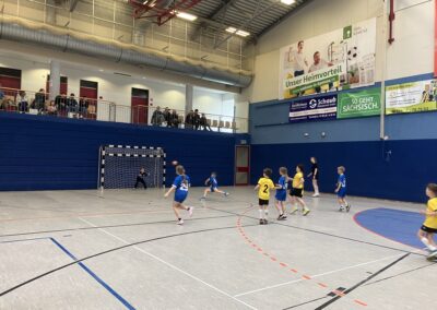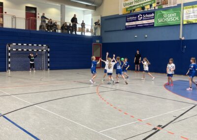 Unser erster Gegner war der HSV 1923 Pulsnitz, aktuell Tabellenführer. Von Beginn an war uns klar, dass dies eine große Herausforderung werden würde, doch wir starteten voller Motivation ins Spiel. Leider zeigte sich in der ersten Halbzeit unser Hauptproblem: das Fangen der Bälle. Trotz guter Zuspiele gelang es uns nicht, den Ball zu kontrollieren, was dazu führte, dass der Gegner oft in Ballbesitz kam. Auch in der Deckung standen wir oft nicht optimal und ließen dem Gegner zu viel Raum. So verlief die erste Halbzeit für uns enttäuschend und wir konnten trotz aller Anstrengungen kein Tor erzielen.