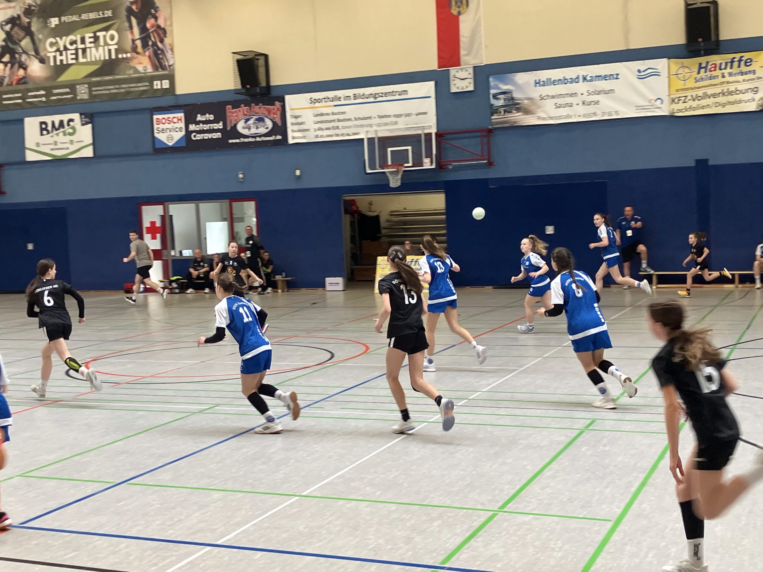 So ging es auch in die Partie und bereits nach 50 Sekunden stand da ein 2:0 für die Gastgeberinnen an der Anzeigetafel. Es sollte dann bis zur sechsten Minute dauern, bis auch die Görls ihren ersten Treffer bejubeln durften. 4:1 hieß es da für Kamenz. In den folgenden fünf Minuten plätscherte das Spiel weiter so vor sich hin und wollte nicht so richtig Fahrt aufnehmen. 8:1 für Kamenz. Nachdem nun kurz hintereinander die Gäste zweimal den Ball im Netz unterbringen konnten, war der Knoten endlich geplatzt und die Lessingstädterinnen drehten das Ergebnis bis zur Pause auf 20:4. In der Kabine wurde nochmals klar besprochen, was an diesem Tag das Ziel ist, nämlich weiter an der Abwehr pfeilen und im Angriff das Zusammenspiel verfeinern. Leider sollte es anders kommen.